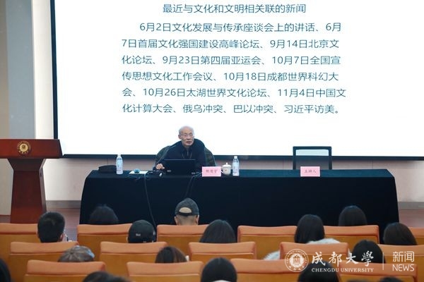 下午2:30,讲座在博物馆报告厅拉开帷幕。熊澄宇教授以“担负起新的文化使命”为主线,指导师生如何在新的历史起点上推动建设中华民族的现代文明。他指出,只有充分了解中华五千年的文明,才能理解如何在新的历史起点上建设中华民族的现代文明。文化是一方水土一方人的存在,表现的是差异;文明是社会发展的过程,表现的是融合。文明包含着科学技术的迭代、产业经济的发展、社会形态的进步,文明的内涵外延比文化的内涵外延更大。传播与传承紧密相连,传播为传承奠定了基础,决定了传承的内容和媒介,从传播到传承,是空间维度向时间维度的延伸。