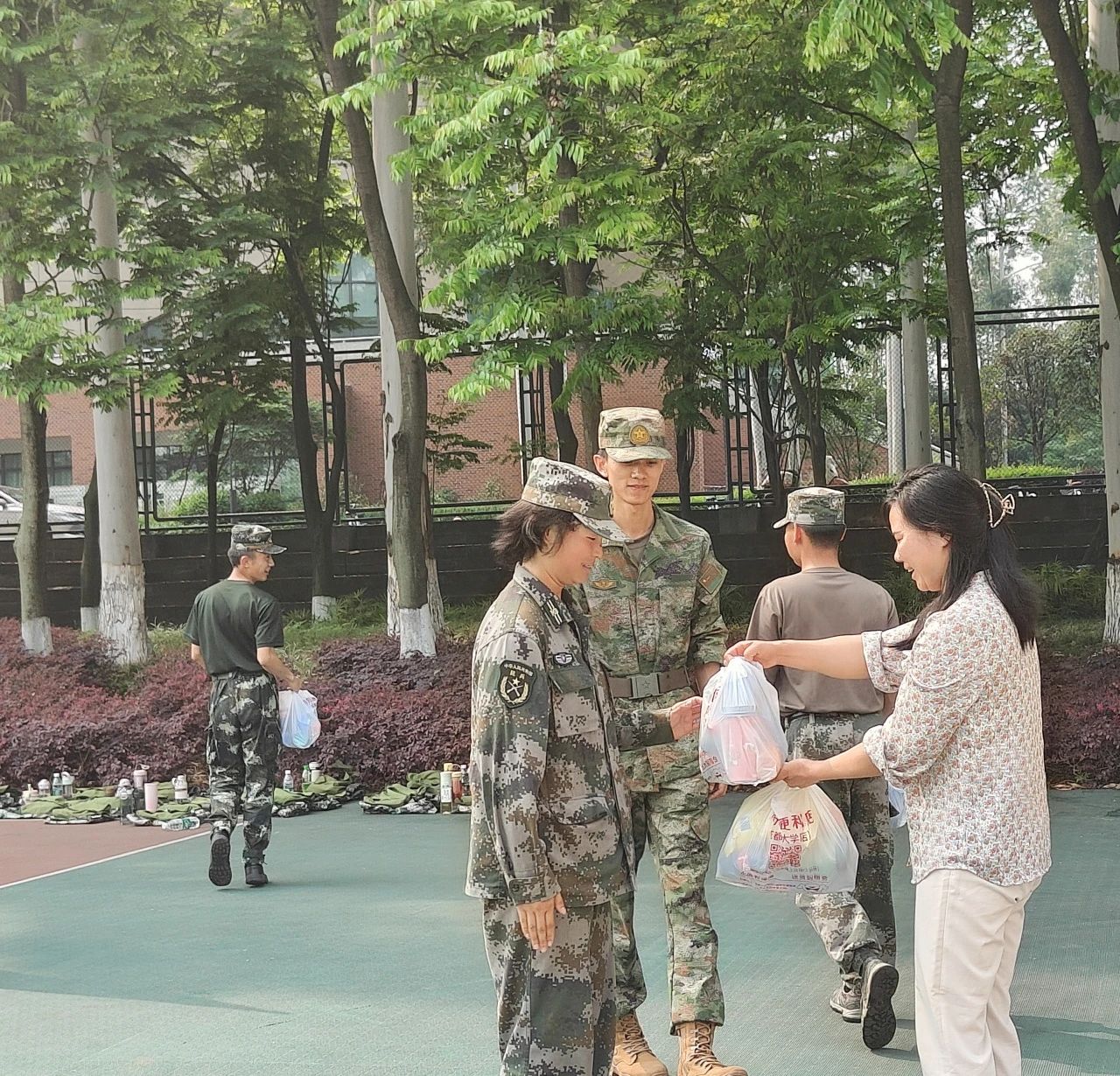 随后,周书记一行为全体教官和参训的同学们送来了特别准备的慰问品,给予在训同学们关怀与慰问,并叮嘱同学们要注意防暑降温,保持身体健康。希望这些慰问品能为同学们的军训生活增添一抹亮色,激励同学们继续向前。