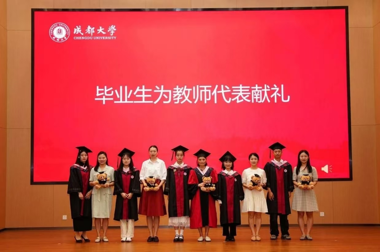 毕业生代表为教师代表献礼,感恩老师的辛苦栽培。