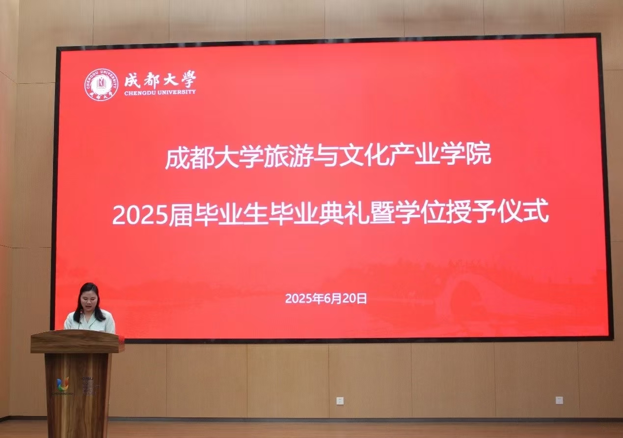 诸丹院长深情致辞,热烈祝贺同学们圆满完成学业、顺利踏上人生新征程!在同学们的共同参与下,学院发展实现重大突破:四大专业在学科建设中屡创佳绩,国际合作平台持续拓展,"三城三都"战略实践纵深推进。同学们以青春之力见证学院在数智转型中突破创新,在国际化浪潮中开拓进取,更以实战担当诠释了"创意性应用型人才"的培养成效。临别之际,他希望同学们:以理想为灯,将家国情怀融入文旅强国征程;以本领为刃,携实战匠心勇立时代潮头;以力量为基,承校训精神踏石留痕。最后他以诗相寄:"希君生羽翼,一化北溟鱼",希望同学们乘长风破万里浪,在锦绣河山中书写属于时代的答卷!