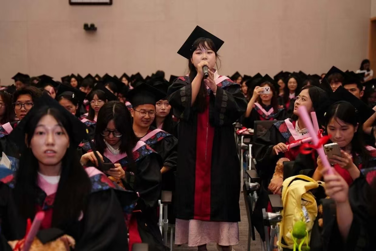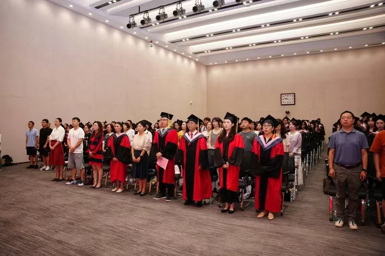 开场视频里,学校与学院的一个个场景光影流转,是教室中求知的专注面庞,是校园小径上四季的更迭,一帧帧,都是青春里最珍贵的注脚。当国歌的旋律响起,全体师生肃立,激昂声浪中,家国情怀与毕业的期许交融,为这场青春的告别,注入庄重的底色。