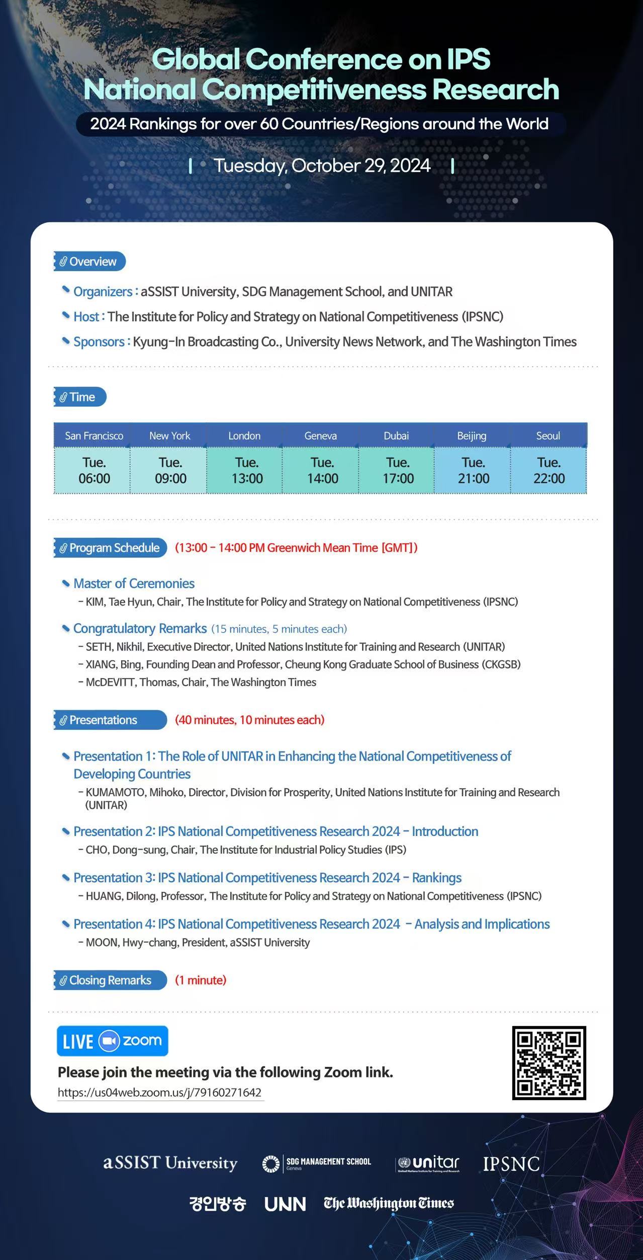 国际学术界备受瞩目的全球IPS国家竞争力研究学术会议于2024年10月29日隆重召开。本次会议由ASSIST大学、SDG管理学院和UNITAR联合组织,旨在探讨和分析全球60多个国家(地区)的国家竞争力。
