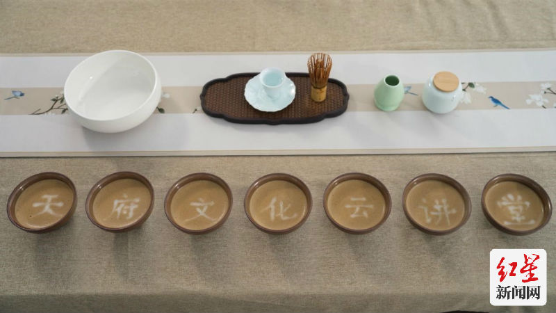 陈舒慧为大家演示了雅致精巧的点茶步骤和茶百戏写字作画的过程,她轻执茶匙,稍稍蘸取杯中清水,在绵密的茶汤沫饽上点画。清水划过之处,沫饽变成了白色,不大一会儿,一个圆润古拙的“茶”字便浮现在了茶汤之上。以茶汤为布,茶百戏不止可以写字,还可以绘制出许多瑰丽多变的景象,如山水云雾,花鸟鱼虫等等。与咖啡拉花用奶泡与咖啡液两种不同颜色叠加形成图案的原理不同,茶百戏是只用清水在茶汤表面点画幻变图案,这是最关键的一点,难度也更大。茶百戏将茶由品饮上升为艺术,是中国茶文化鼎盛时期的产物,反映的是宋人高雅的艺术情操和丰富的精神世界。”