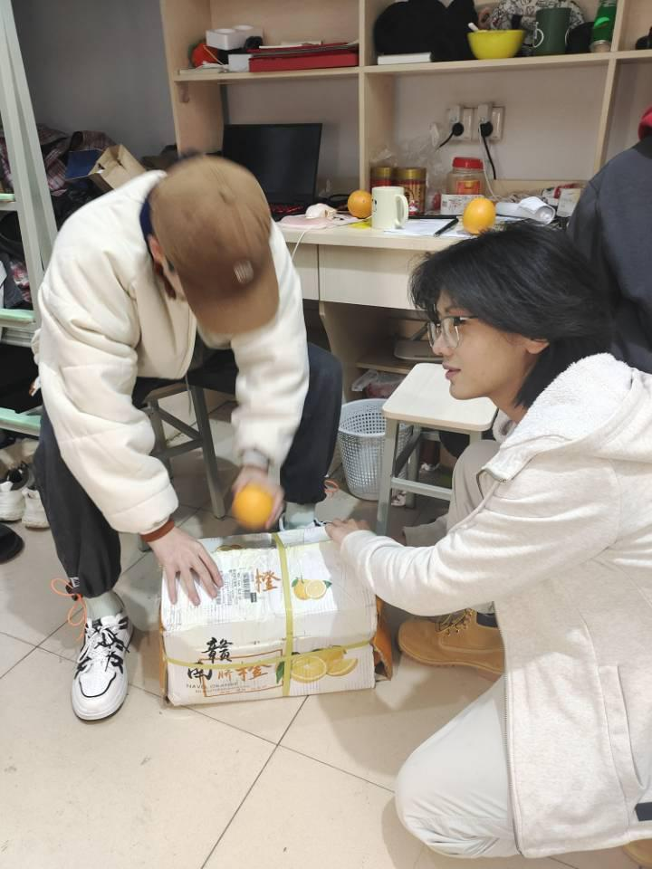 在心理调节方面,彭向阳同学和聂佳鑫同学有不同程度的焦虑。华昆同学积极与他们沟通,了解他们内心的困惑,力所能及的基础上给出相应的劝慰与见解。彭向阳同学在其鼓励下,极大缓解了焦虑,保持“劳逸结合”的学习节奏,一步一个脚印前进。此外,华昆同学同323寝室成员不定期聚餐,保持热烈的寝室氛围,把家乡特产赣南脐橙分给他们品尝,在交流与生活上保持高度联系,寝室氛围其乐融融。