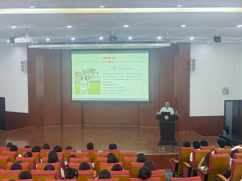 祝郁欣老师结合当前时代发展需求与青年成长特点,阐释了“为什么要入党”“入党对个人成长有何意义”等问题。并围绕“申请入党基础知识和基本要求”及“学院学生党支部基本情况”进行详细解读。他从入党申请的撰写规范、入党流程的关键节点、党员发展的标准条件等基础内容入手,用清晰的流程图和通俗的语言,为新生梳理了申请入党的全流程;同时,还介绍了学院学生党支部的组织架构、特色活动及作用发挥情况,让新生们对党支部有了更直观、更深入的认识。此外,祝老师还分享了学院优秀党员青年的先进事迹,其中既有在学术科研中勇攀高峰、成功考取名校研究生的学霸党员,也有在志愿服务、社会实践中甘于奉献、考取选调生投入乡村振兴的榜样典型。鲜活的案例、感人的故事,让新生们深受触动,现场不时响起阵阵掌声。
