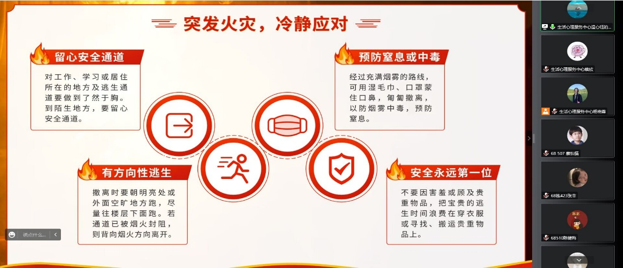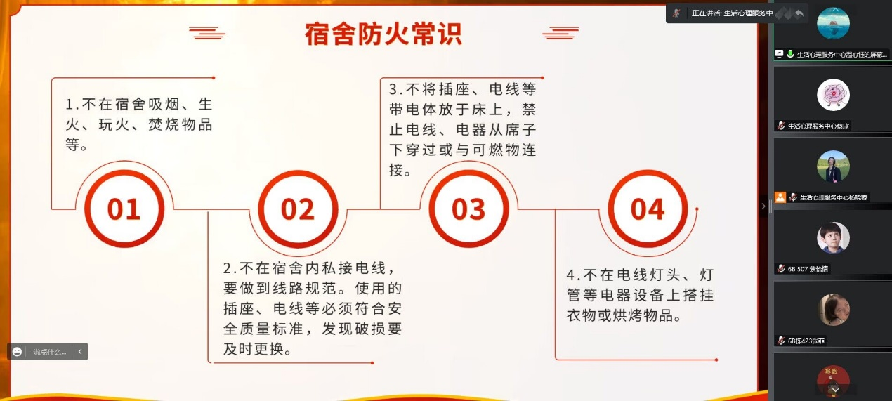 生活心理服务中心在线上组织开展了119消防安全主题宣讲,2021级、2022级生活委员和宿舍长积极参与了此次宣讲。