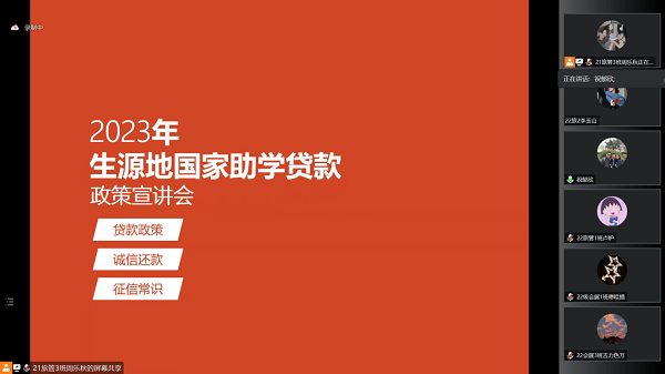 在班级、年级、专业间组织召开专题宣讲会,大力宣传生源地助学贷款相关政策,帮助学生了解生源地信用助学贷款的相关信息,确保政策宣传不漏一人、不留死角。面向毕业学生,重点组织开展诚信还款、征信常识宣讲活动,为减轻家庭经济困难毕业生负担,继续免除毕业的贷款学生今年内应偿还的国家助学贷款利息,本金部分可再申请延期1年偿还,延期贷款不计罚息和复利;组织毕业的获生源地国家助学贷款学生,在线签订《生源地信用助学贷款还款承诺书》;对延期毕业、本专科期间申请了助学贷款并考取研究生后、以及就学信息有变化(如专升本、入伍、休学等)等仍需要继续申请助学贷款的学生,特别提醒按通知要求完成“就学信息变更”,以确保贷款相关信息及时更新(如利息、还款时间变化等)。面向非毕业生,重点做好生源地信用助学贷款政策宣传,对象是家庭经济困难学生,用途是解决学生学费和住宿费困难,对于原建档立卡等特殊困难群体的同学,可申请按最高额度办理贷款,其他同学则按学费标准和住宿费标准之和来办理贷款;并详细介绍生源地信用助学贷款办理程序,提醒同学们在假期及时联系入学前户籍所在县(市、区)的学生资助管理中心咨询办理续贷工作。