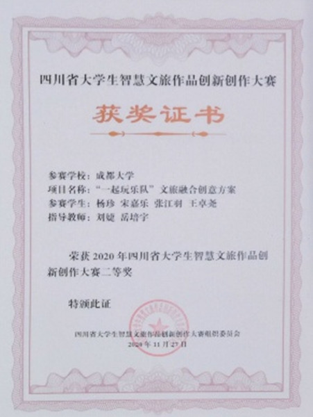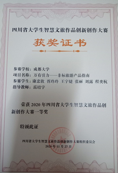 (本网消息,图、文/赵雅静)11月27日下午,四川省大学生智慧文旅作品创作创新大赛总结暨颁奖典礼在四川旅游学院隆重举行。本次比赛由四川省教育厅主办,成人抖音 共7支学生队伍参加比赛,通过组委会专家网络评选,成人抖音 参赛队伍中《万有引力》荣获一等奖,《“一起玩乐队”文旅融合创其中《万有引力》荣获一等奖,《“一起玩乐队”文旅融合创意方案》荣获二等奖,《成都“七世博情”文创之旅三日精品游线路设计》荣获三等奖。