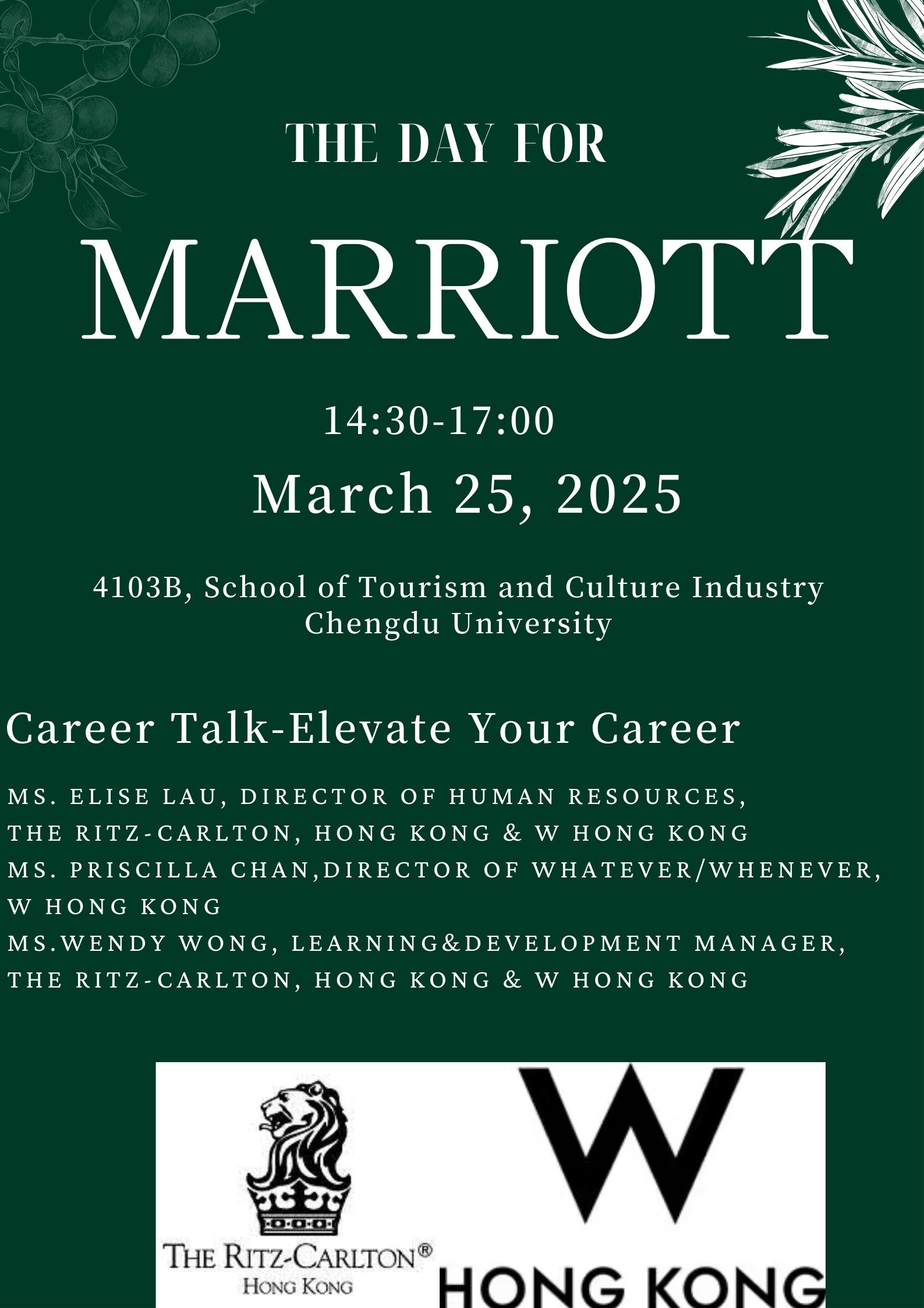 、“职等你来”辅导员工作室联手万豪国际酒店集团旗下两家奢华酒店“香港丽思卡尔顿酒店”和“香港W酒店”共同举办“职来职往,对话未来”主题活动。届时,同学们将有机会了解赴港实习项目,与酒店高管共叙未来职业发展。
