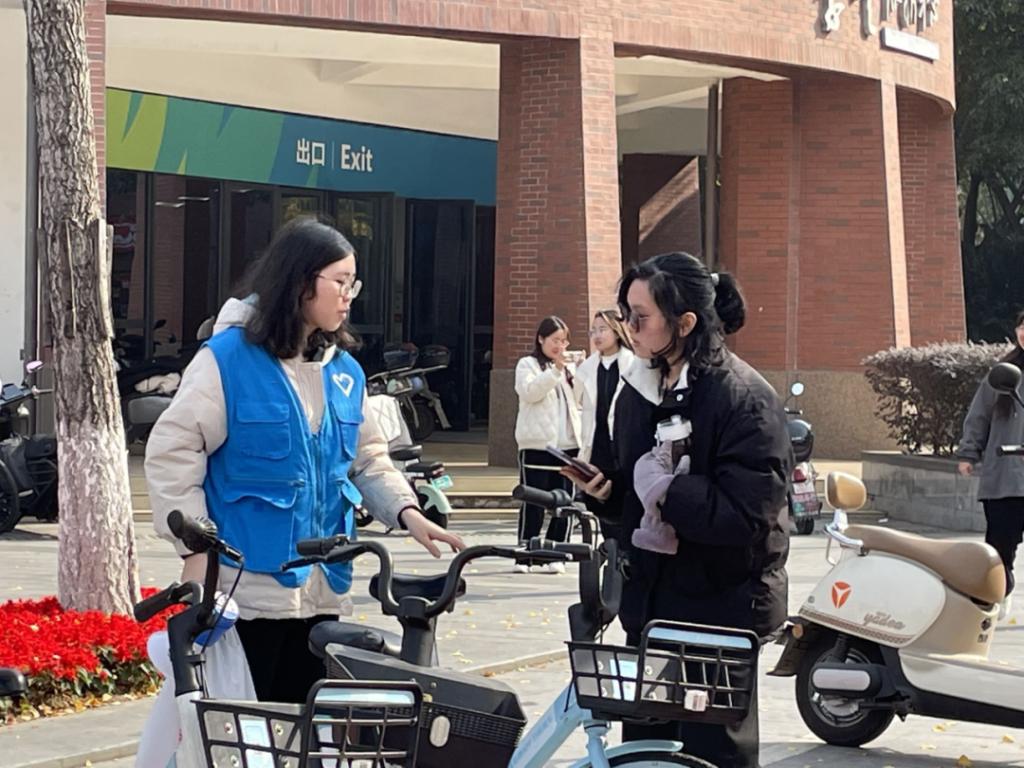 的志愿者们尽职尽责,针对同学们在骑行中的违规载人以及骑车看手机现象,及时纠正引导,并为遵守骑行规则的同学发放绿色骑行卡。同时,积极摆放整齐活动开展地点周围的共享单车,维护校园环境整洁,为同学们的上下课出行提供便利,获得了同学们一致好评。