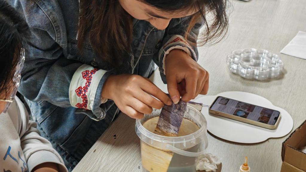 除了画扇活动外,现场还设置了制作漆书签的点位。同学们以漆为墨,以扇为纸,精心创作着一幅幅精美的漆书签作品,展示着自己独特的创意,感受漆艺的独特魅力。