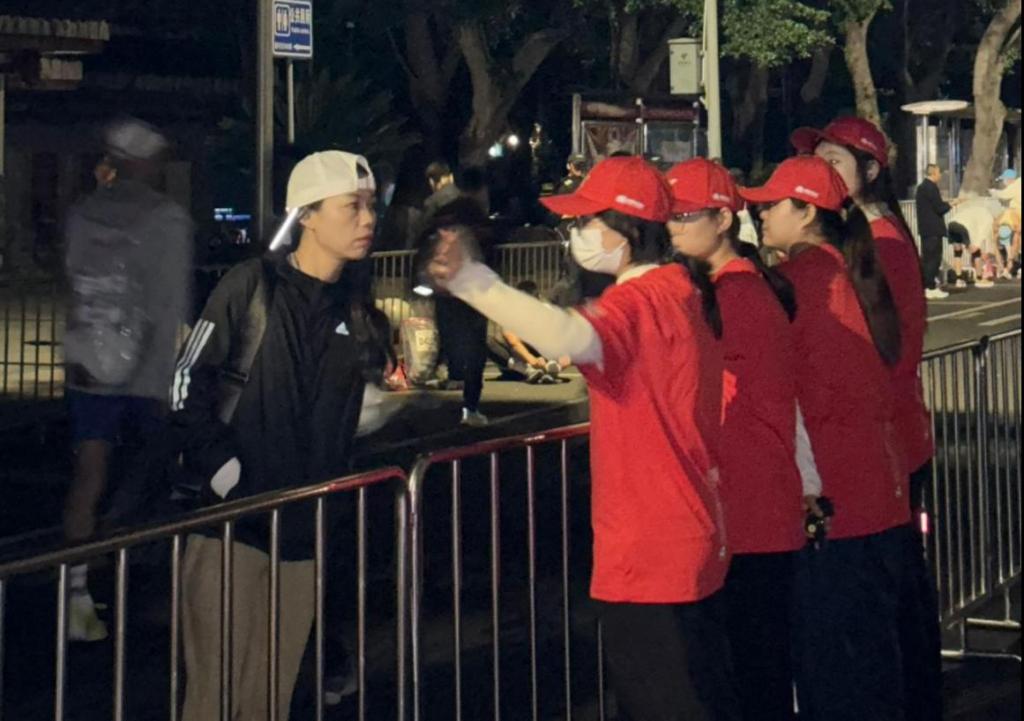 的志愿者们到达岗位,安装隔板、摆放标识物、组装头灯。随着运动员入场,志愿者们开始为运动员提供物资发放、指引道路等服务。
