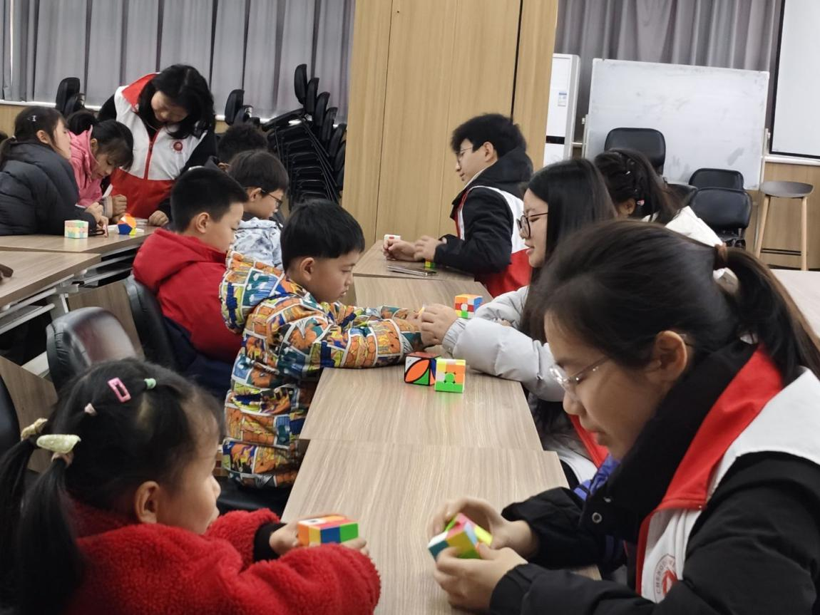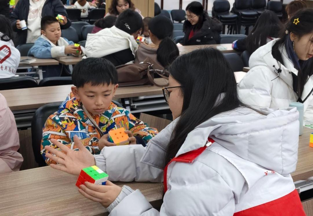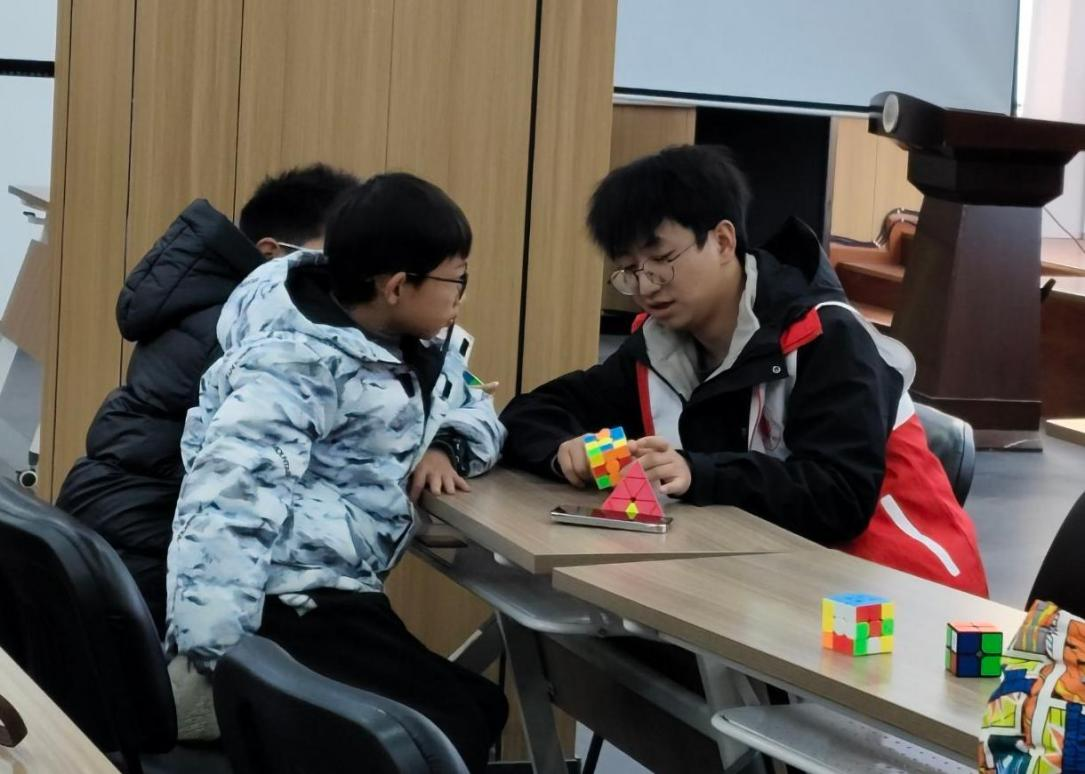 在魔方教学区域,志愿者们采取一对一、一对多的模式,手把手地指导社区小朋友们学习魔方的还原技巧。从基础的魔方结构知识讲解,到逐步传授各种还原公式,志愿者们耐心细致地解答居民们的疑问。许多居民在志愿者的指导下,成功还原了魔方,脸上洋溢着喜悦与成就感。