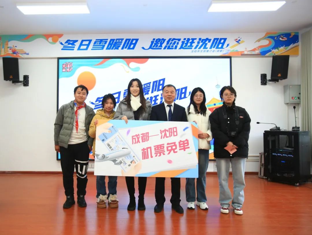 沈阳文旅局采用“资源推介+快闪路演”的形式,全面展示沈阳文旅特色,局长刘克斌进行文旅推介并发放由东北花布、不老林糖、沈阳鸡架、沈阳城市地图等特色美食和文创组成的文旅礼包。五位同学获得由春秋航空港提供的沈阳-成都/重庆往返机票,十五位同学获得沈阳北汤温泉景区的免费门票。