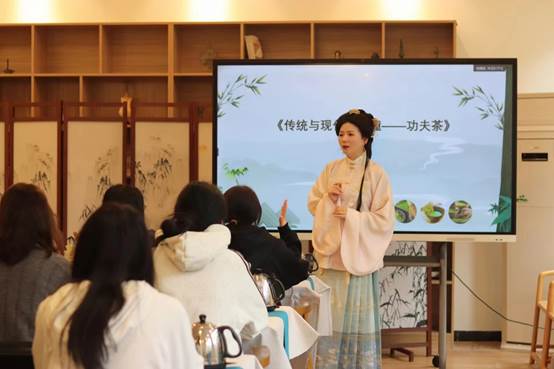 本次活动分为理论讲解和盖碗冲泡方法两个部分,首先由陈舒慧老师讲解明代泡茶法的起源和流程,明代的泡茶法起源于明太祖朱元璋,他废除了进贡龙团贡茶而改为贡散茶,点茶法随之衰落,唐煎宋点饮法变成了沸水冲泡的瀹饮法。其次讲解现代工夫茶,现代功夫茶的起源可以追溯到中国福建地区,距今已有几百年的历史,随着时间的推移,泡茶的方式逐渐被人们归纳总结为“工夫”,同时也被视作一种文化的象征,代表着中国人文化的深厚底蕴和生活方式的精致品味。
