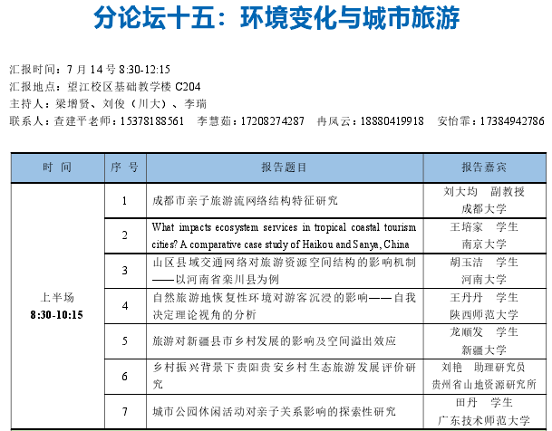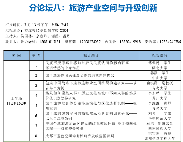 受大会邀请,诸丹院长出席大会并担任分论坛八:旅游产业空间与升级创新的主持人,刘大均老师在分论坛十五:环境变化与城市旅游分论坛作了题为“成都市亲子旅游流网络结构特征研究”的学术报告,万春林博士、韩淼博士等老师以及同学也参加了此次会议。通过参加此次学术会议,成人抖音