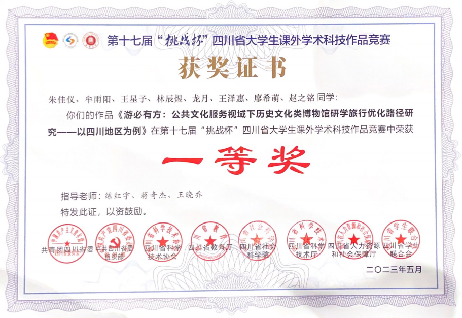 会展与经济管理专业朱佳仪同学牵头的项目《游必有方:公共文化服务视域下历史文化类博物馆研学旅行优化路径研究——以四川地区为例》,在公共文化服务视域下,从博物馆方切入,探讨其在推动公共文化服务转型升级、实现公众文化自信中的实施路径。该项目使用python等数据挖掘软件数获取网络文本数据,运用ACSI模型供求双方现状,数值仿真构建动态博弈模型,并利用统计软件进行实证分析;同时运用三元博弈的方法,对研学旅行参与主体投入及资源分配进行模拟数值运算,将产学研一体的研究引入公共文化服务领域。项目契合区域经济发展热点,研究方法创新,从科创杯立项开始,项目不断打磨完善,经过初赛、复赛、终审决赛,最终获得一等奖的优异成绩。