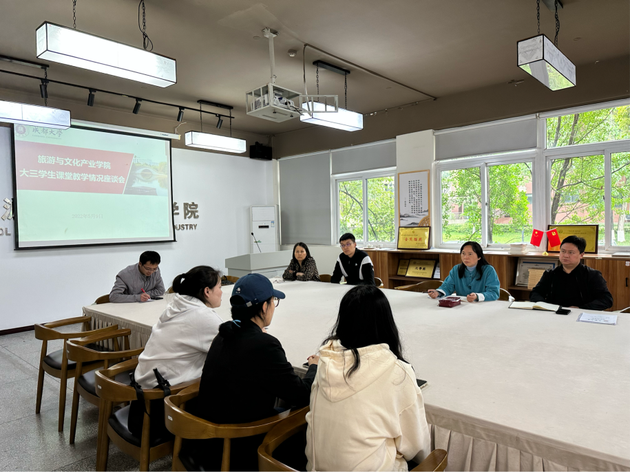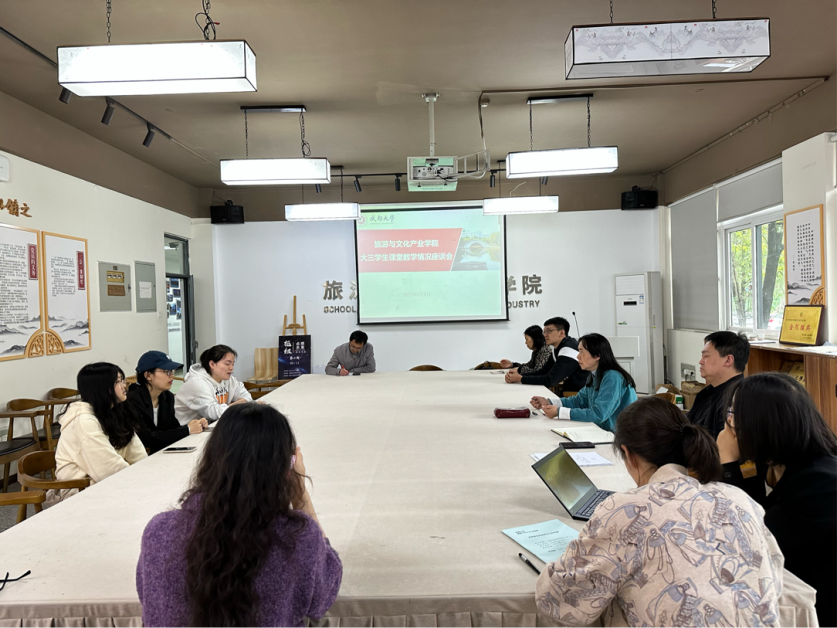 为深入调研大三年级学生课堂学习情况,进一步提升人才培养质量,2023年5月9日上午,旅游系在4102学院会议室组织召开了大三学生教学情况专题调研座谈会。学院副院长练红宇、旅游系主任陈颖、系副主任张寅玲、大三学生代表和相关授课教师出席了会议,会议由练红宇副院长主持。