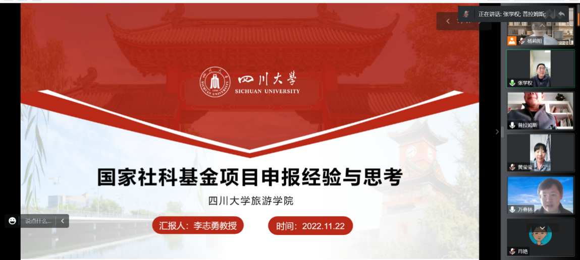 本次讲座与辅导会邀请了四川大学李志勇教授作为讲座嘉宾。李志勇教授系四川大学旅游学院教授、博士生导师,现任四川大学旅游学院副院长、四川大学旅游管理专业负责人,系多个国家社科基金项目主持者。李院长在本次讲座上详细讲述了国家社科项目特征、旅游类课题相关方向申报难度,并结合自己国家社科项目申报、评审经历,从选题、课题论证、完成项目的条件和保障等角度与到会老师进行了经验分享。辅导过程中,李教授采用一对一指导方式对成人抖音