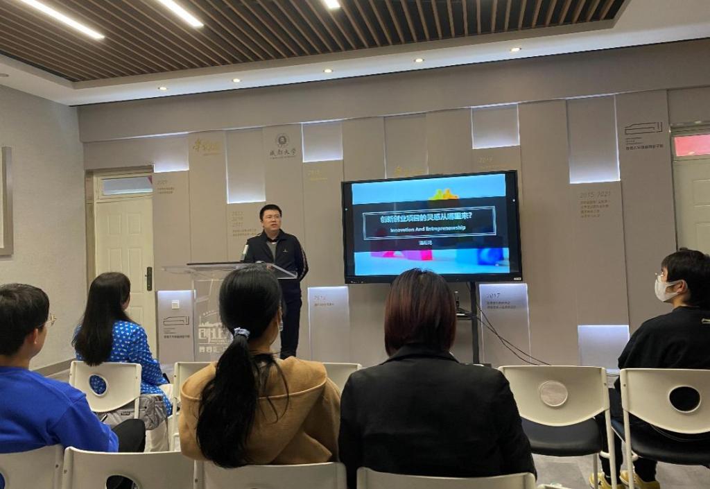 潘希鸿教授以“创新创业项目的灵感从哪里来?”为主题,从创新篇、创业篇、“互联网+”金奖项目复盘等方面通过举例进行了详细的介绍。
