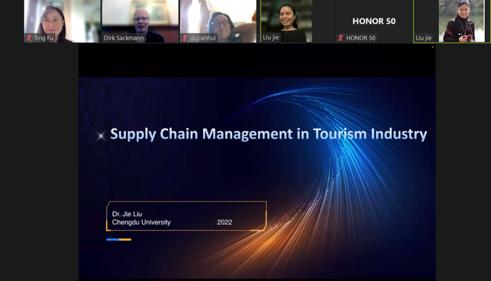 副教授刘婕博士,为该校及其国际合作伙伴学校师生作“Supply Chain Management in Tourism Industry”的主题分享。