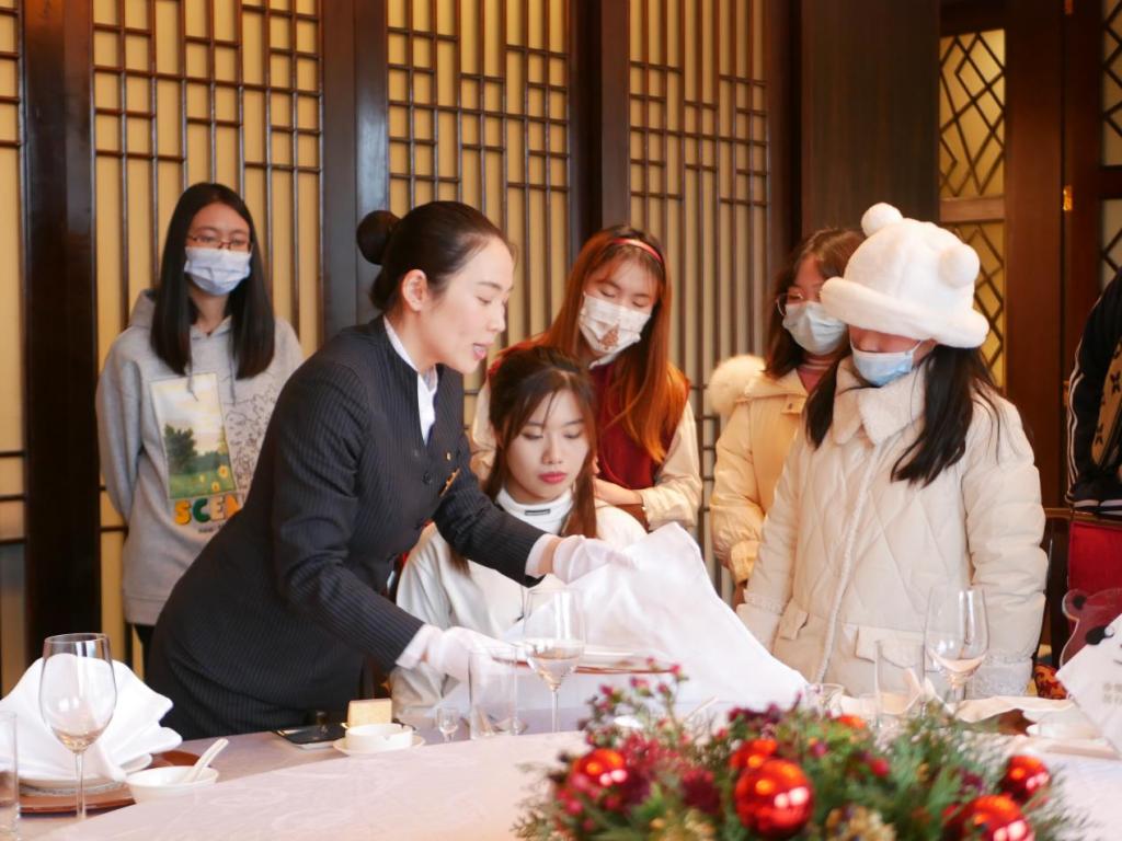 接待过多个国家元首的中餐厅经理Ava Ping为同学们示范VIP服务