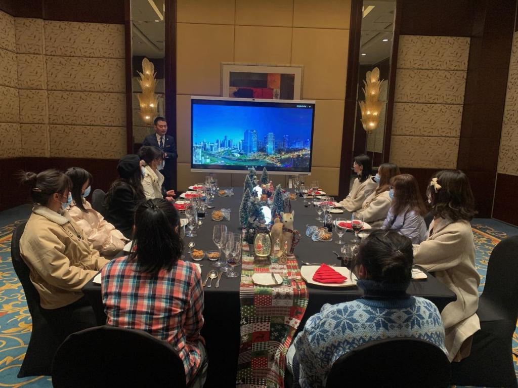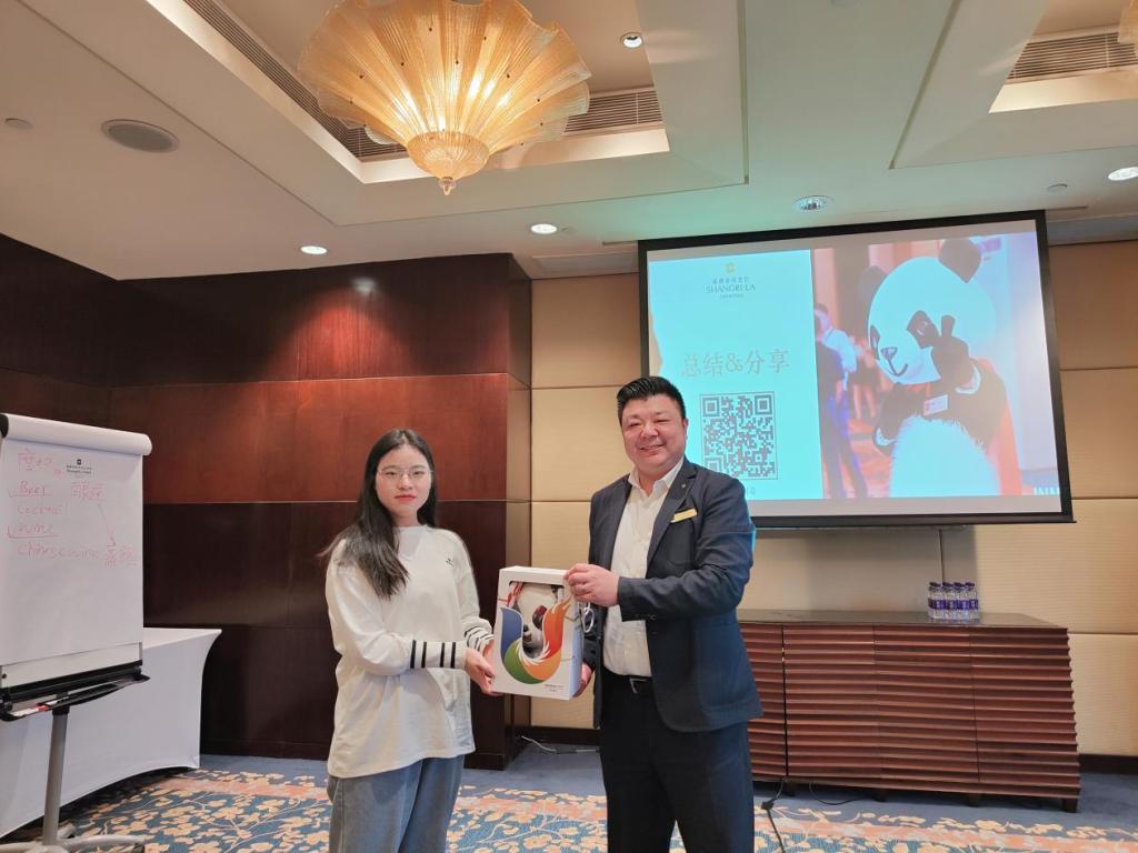 首先,酒店区域人力资源部副总监赵瑞坤先生对师生们的到来表示欢迎、培训总监李书女士介绍了香格里拉的历史文化、经营理念及核心竞争力。接着,招聘经理王菁为同学们设计了一个归国华侨家庭的三日旅居场景,让同学们根据场景,充分发挥想象和创意,合理运用酒店礼宾、餐饮和宴会三个部门的核心产品与定制服务,在礼宾部主管Tayler Wang、中餐厅经理Ava Ping、宴会经理Edwin Deng的帮助下,设计一个包括旅游线路、文化体验、宴请安排在内的VIP接待方案。