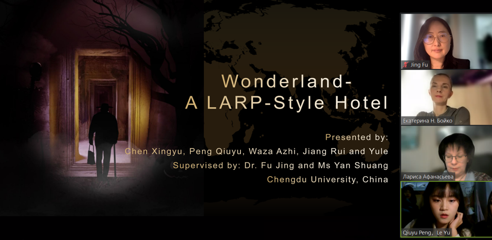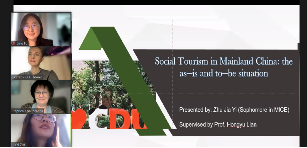 七名本科学生用英语和中文分别在平行论坛中做了“Social Tourism in Mainland China: the as-is and to-be situation”、“Wonderland —LARP Style Hotel”、“三星堆特色时光小镇营造研究”和“掌上酒店:智慧云游玩酒店”的主题汇报。