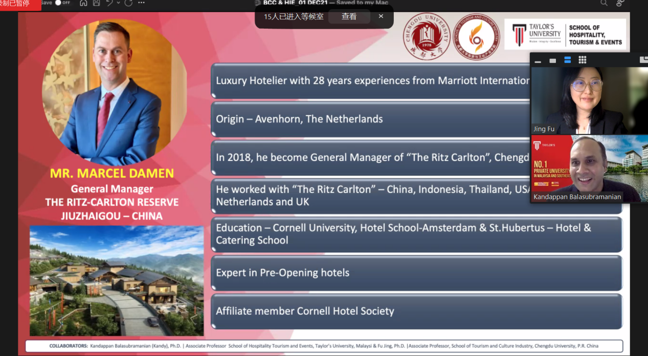 携手2021年度“酒店及休闲业管理”学科QS全球排名第17位的马来西亚泰莱大学酒店、旅游与赛事管理学院(School of Hospitality, Tourism and Events of the Taylor’s University),云端访谈了成都丽思卡尔顿(The Ritz Carlton)前任总经理、九寨沟丽思卡尔顿度假酒店现任总经理Marcel Damen先生。