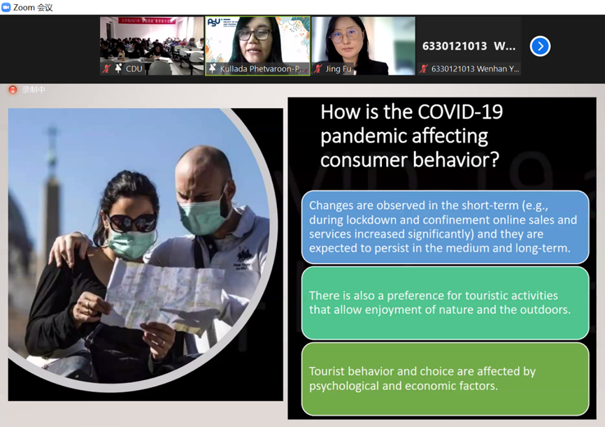 付静博士作为对话嘉宾,结合其在疫情期间的调研案例,做了“Tourism and Service Trends in China: challenges and opportunities in the new normal era”的主题分享。双方老师以图文并茂的讲解和精彩的对话激发出同学们的强烈兴趣,大家积极参与、踊跃提问,老师们也热情解答了同学们关于疫情下中泰旅游业如何恢复发展的诸多疑问。