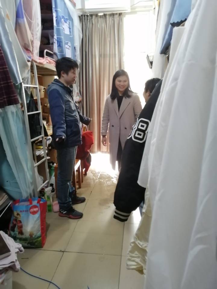 寝室是同学们休息的地方,是同学们学习生活中的驿站。保持寝室卫生,注意用电安全,养成良好的寝室卫生习惯,可以让同学们每天都拥有良好的心情,有更好的心态来学习。每走进一间寝室,老师和同学们都进行了深度的交流,了解同学们的生活情况:追星的横幅、新年对联的含义,这些毫无代沟的对话,拉近了老师与同学之间的距离,也更好的让同学们了解注意用电安全的重要性。安全连着你我她,平安幸福靠大家。