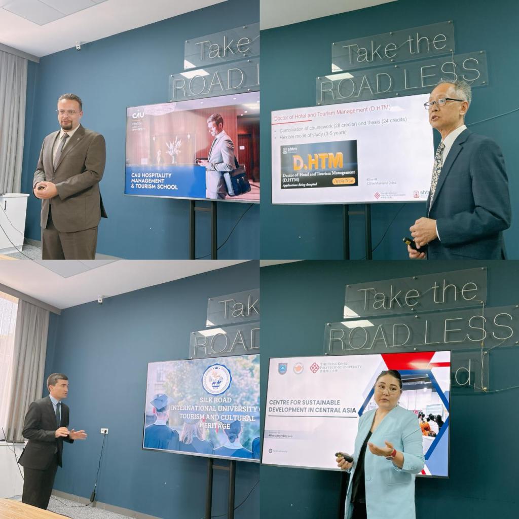中亚大学酒店及旅游业管理学院院长Erdogan Ekiz教授、香港理工大学酒店及旅游业管理学院Tony Tse实践教授,丝绸之路国际旅游与文化遗产大学旅游管理系主任Akmaljon Odilov教授、阿里-法拉比哈萨克国立大学商学院Aliya Aktymbayeva教授做主题分享。