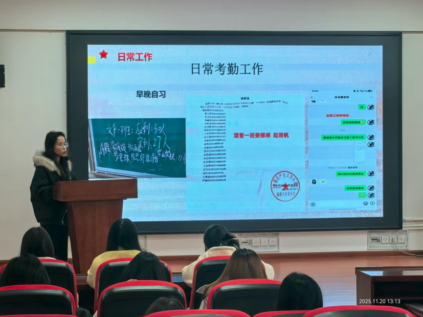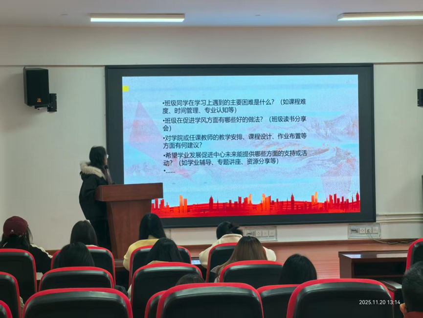 负责人陈璐在开场中明确了学委的核心角色:作为班级学风建设的“带头人”与师生沟通的“桥梁纽带”,学委是推动优良学风落地的关键力量。她表示,本次座谈会旨在搭建学院、班级、学促中心与同学的沟通平台——既聚焦学风建设的现存问题,也广泛收集学委与同学的意见建议,让“学生声音”成为优化学风的重要参考。