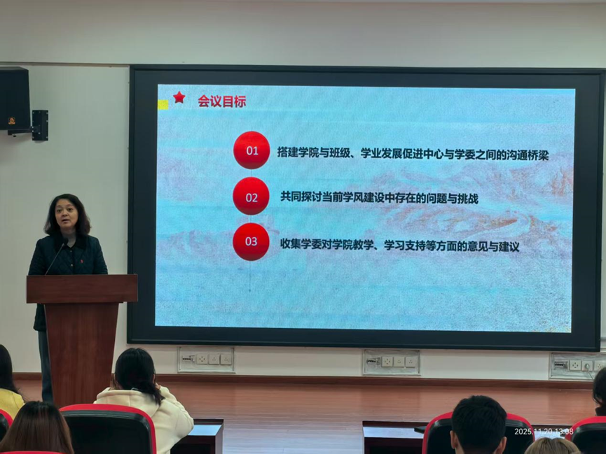 学委座谈会在四教4103B顺利举行,参会人员有学院教务办老师和各班学委代表,在学促中心负责人陈璐的主持下,围绕学风建设、学委工作开展深入交流。